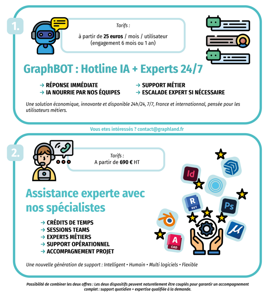 - GraphBOT : support continu, abonnement, assistance quotidienne (IA + humaine)